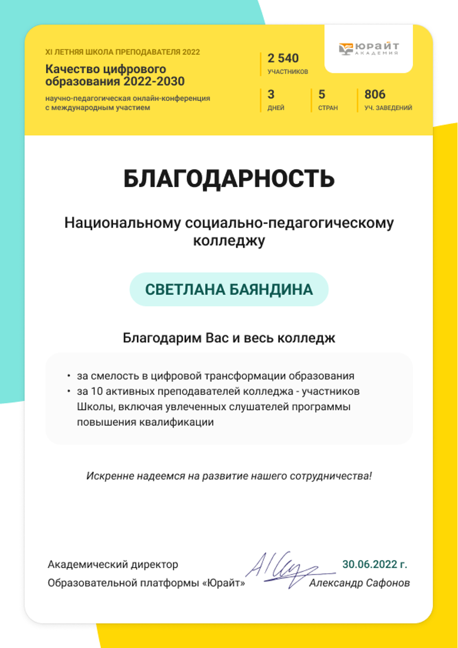 Юрайт.Академия и организационный комитет XI Летней школы преподавателя «Качество цифрового образования 2022—2030» (27—29 июня 2022 г.) — педагогической научно-практической онлайн-конференции с международным участием — благодарят Национальный социально-педагогический колледж за активное участие 10 преподавателей в самой Школе и в реализуемых в ее рамках программах повышения квалификации.