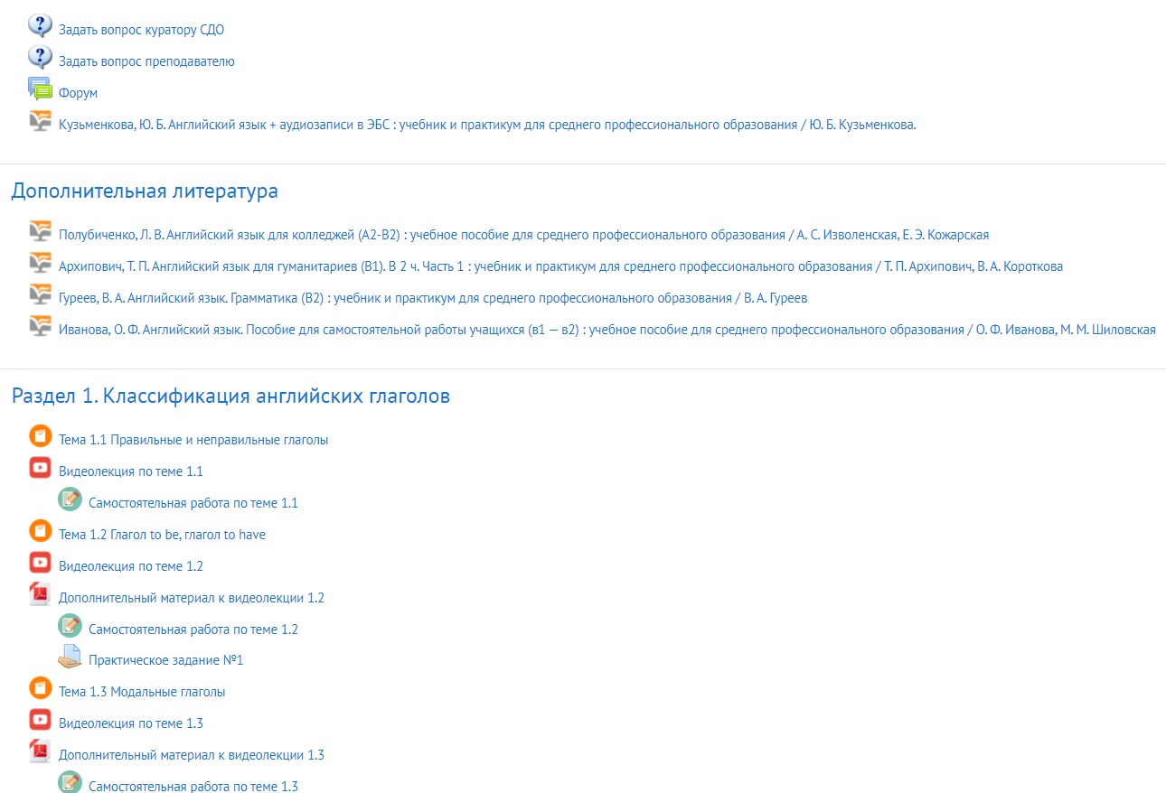 Содержание курса «Английский язык» (Скриншот из личного кабинета студента в Электронной информационно-образовательной среде)